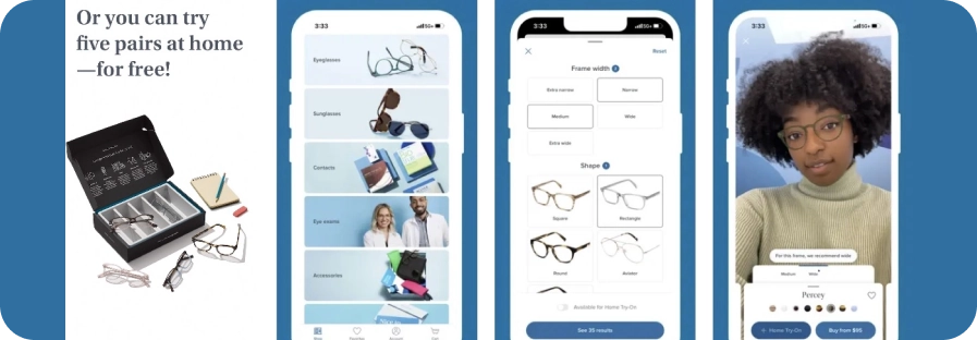 The Warby Parker app makes it easy for customers to choose the right frames, as they can see the glasses on their face before making a purchase. Additionally, the app is engaging. The interface is user-friendly, and the feature’s swiping function makes for an enjoyable experience.